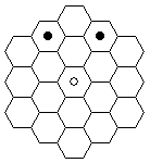 Американцы вступили в интеллектуальный турнир на этом поприще только в 1975 году патентом Д. Дженкинса с описанием игры для двух и трёх игроков. Чтобы обойти патент В. Глинского, американец применил еще более крупную доску, доведя тем самым изначальную плотность игры до катастрофически малой величины. На основании вышеизложенного Петербург вполне может сказать свое слово в окончательном оформлении гексашахмат. Первавя публикация гексашахмат автора настоящей статьи состоялась в СПб газете«Игрок» - в сентябрьском выпуске 1997 г. При этом были устранены все недостатки предлагаемых ранее вариантов игры. Перечислим основные параметры «Гексофена». Предлагаемая двухсторонняя шахматная игра осуществляется на доске В. Глинского, то есть на трехцветной правильной шестиугольной гексагональной доске с 91 игровым пунктом. Каждый из двух соперников имеет следующий комплект фигур: король, ферзь, 2 ладьи, 3 слона, 3 коня, 11 пешек. Сумма всех фигур на доске = 42. Отсюда изначальная плотность игры составит: 42 : 91 = 0,46 (у В. Глинского - 0,39). Для того, чтобы упростить рисование многочисленных шахматных диаграмм, автором нового варианта игры предложена новая универсальная символика шахматных фигур с переходом к абстрактным геометрическим символам: