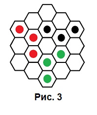 Другие возможности гексагональных структур в реверси были реализованы автором настоящей статьи в варианте под названием ТРИТОН, где каждый из трех игроков имеет по 52 шашки своего цвета — например: белые, черные и красные. То есть в этой игре шашки не переворачиваются, а окружённые заменяются на свой цвет. Ведь невозможно одну шашку раскрасить в три цвета. Исходная расстановка изображена на Рис.3. Первый ход определяется жребием. Результативный ход обязателен. Но окружать уже можно сразу двухцветный плотный ряд шашек, принадлежащий двум другим соперникам.
